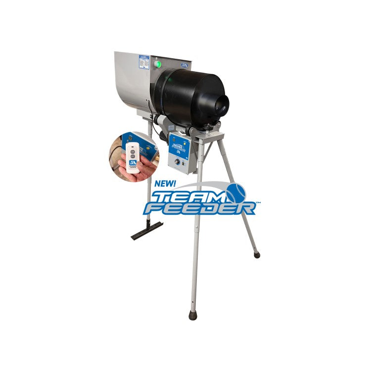 The ever popular 150 ball capacity Team Feeder has a new design plus added features! Will feed a baseball into the I-Hack Attack and Hack Attack at variable speeds (6 to12 seconds or so) for continuous hitting time of 20 minutes.